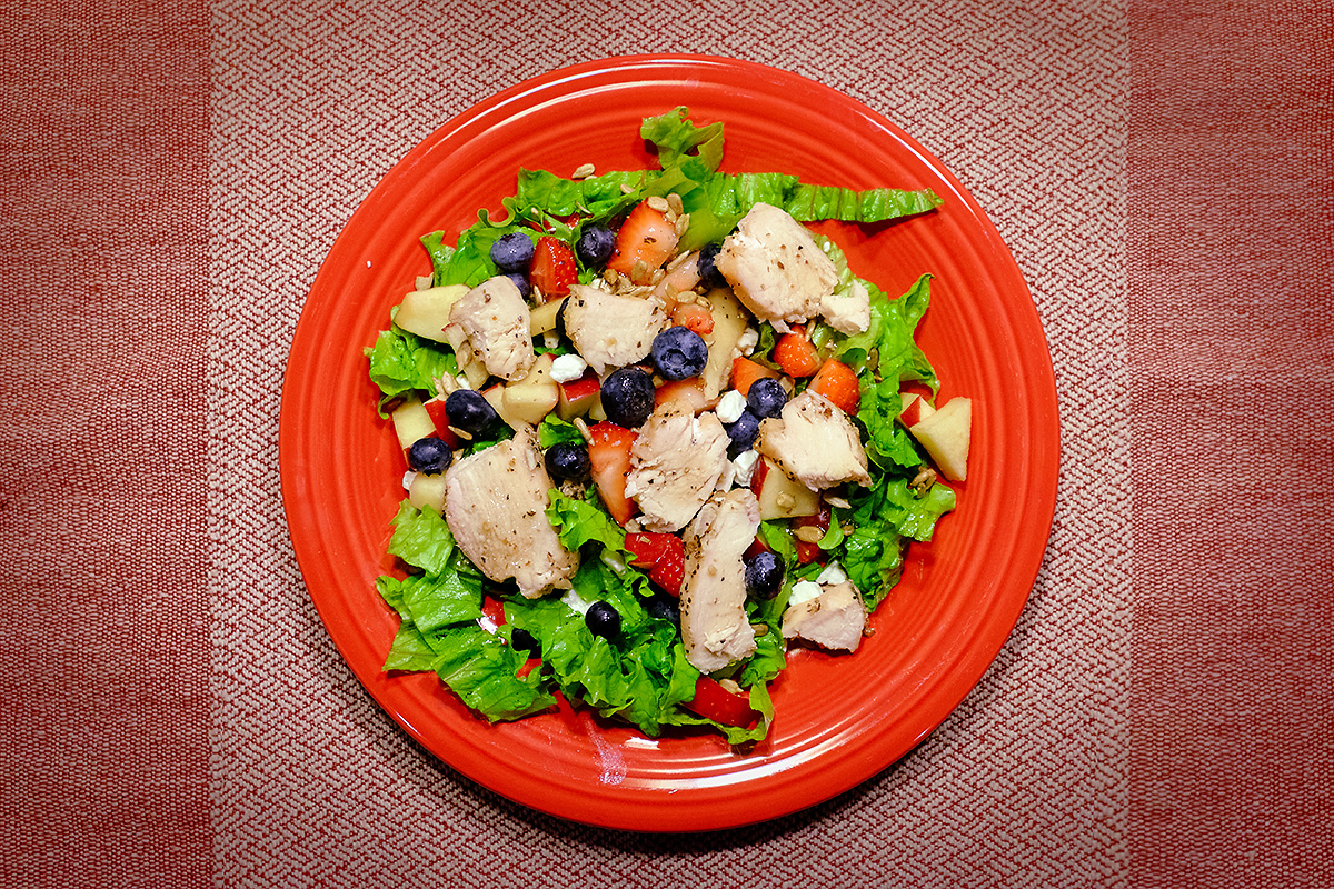 Tonight’s meal: Freshly chopped leaf lettuce, strawberries, blue berries, Gala apple slices, sunflower seeds, feta cheese, grilled chicken courtesy of the Big Green Egg, and a light drizzle of balsamic vinaigrette.