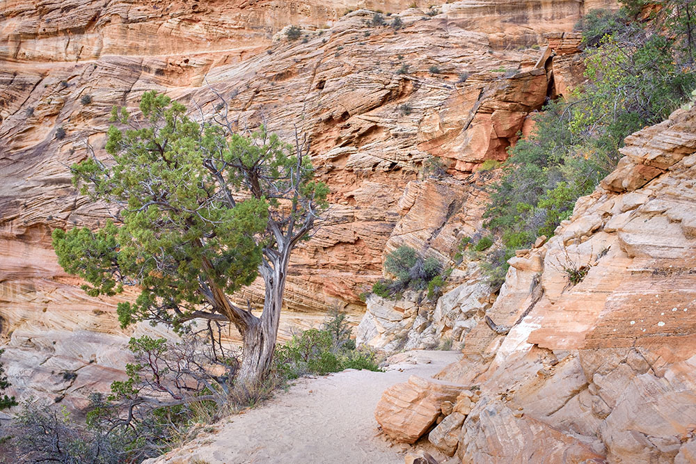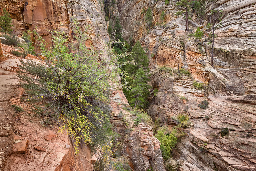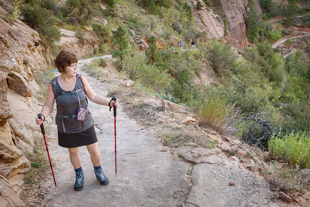 THE famous hike in Zion is Angel’s Landing, which traverses switchbacks and very narrow pathways en route to peak overseeing the canyon. It was closed the first couple of days there, so instead, I decided we would hike to Observation Point on day 2 of our trip. Little did I know … this hike is twice as long and twice as hard as Angel’s Landing. As a matter of fact, its peak looks down over Angel’s Landing like a 747 over the Grand Canyon (see last photo below). The Observation Point trail is 4 miles one way around switchbacks and ridges. There are virtually no level trail segments as you ascend 2,000 feet from trailhead to trail end! Oh … and 4 miles back down was no cake walk after the strenuous climb up.