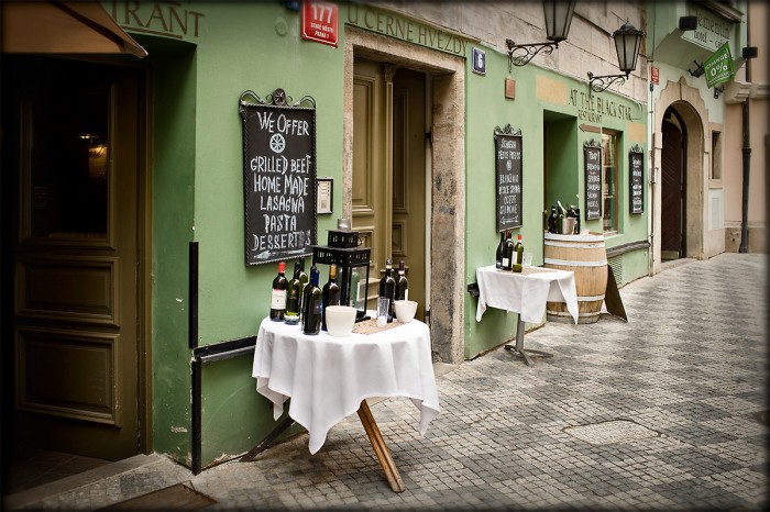 The Black Star Restaurant next to the Hotel U Cerne Hvezdy captured the eyes of a couple of colleagues and I while exploring the streets on our first day in Prague.  The curb appeal was definitely there with the outdoor tables, bottles of wine, and the lovely sidewalk.  So what was the first thing I did?  Take a couple of photographs, of course!  🙂